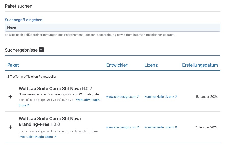 Im folgenden Formular gibt man dann den Stilnamen in der Suche ein und führt eine Installation durch: