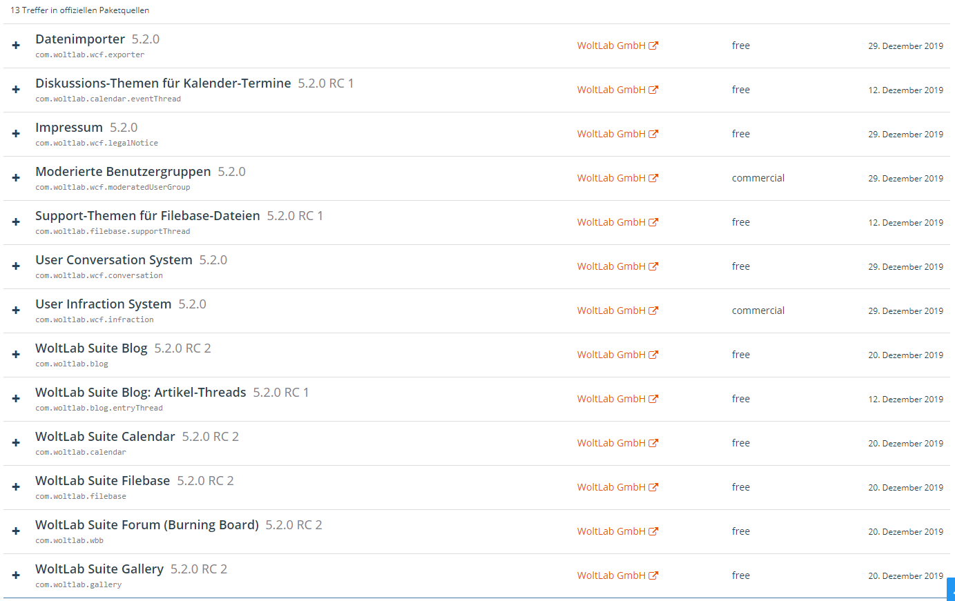 Aktuell finde ich lustigerweise keine Pakete über die WoltLab-Server. Er schreibt mir zwar die Anzahl hin, aber in der Suche sind sie nicht da. Mal sehen, was ich da angestellt habe. ![]()