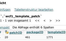 Die Patches werden in der Datenbank in der Tabelle wcfx_template_patch gespeichert. Das x ist durch die Installationsnummer vom WCF zu ersetzen. In den meisten Fällen ist das die 1.