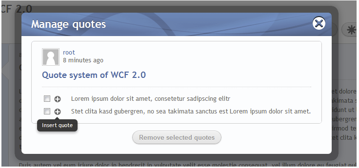 Beim Klick auf das kleine Popup geht dann ein großes Popup auf in dem die Zitate einfügen oder auch wieder löschen kann:
