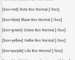 • Das Box – BBCode Plugin ist ein Plugin mit dem man verschiedenfarbige Boxen in einem Beitrag einfügen kann. Inhalt dieser Boxen können Bilder, Texte, aber auch andere Dinge, wie z.B. eine Box in einer Box, sein. Die Box verändert je nach Inhalt auch ihre Größe und Breite, ist somit „frei“ benutzbar.