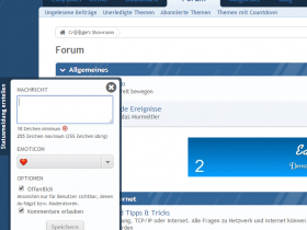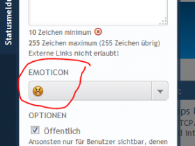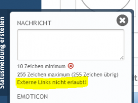 Per Button-Klick öffnet sich ein schlankes Fenster, in dem neben einer Nachricht (Zeichenbegrenzung minimum/maximum Benutzergruppen-Abhängig) auch ein Emoticon zur Symbolisierung der Stimmung/Meinung zu der Nachricht geäußert werden kann.