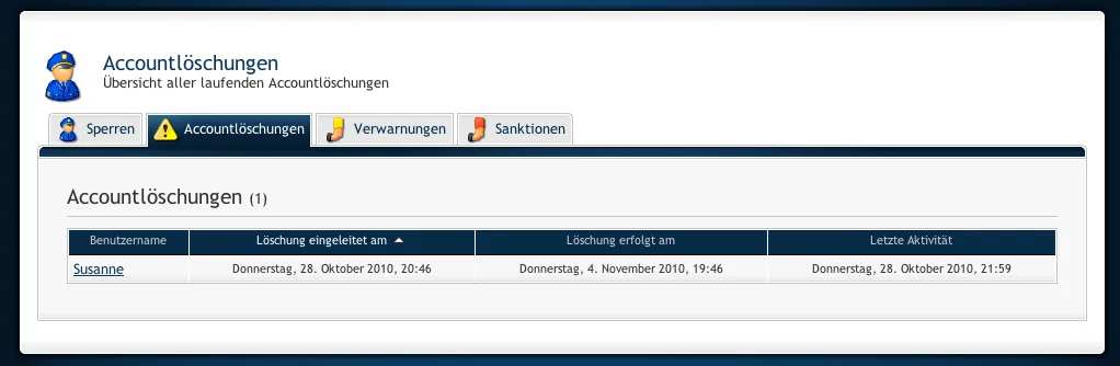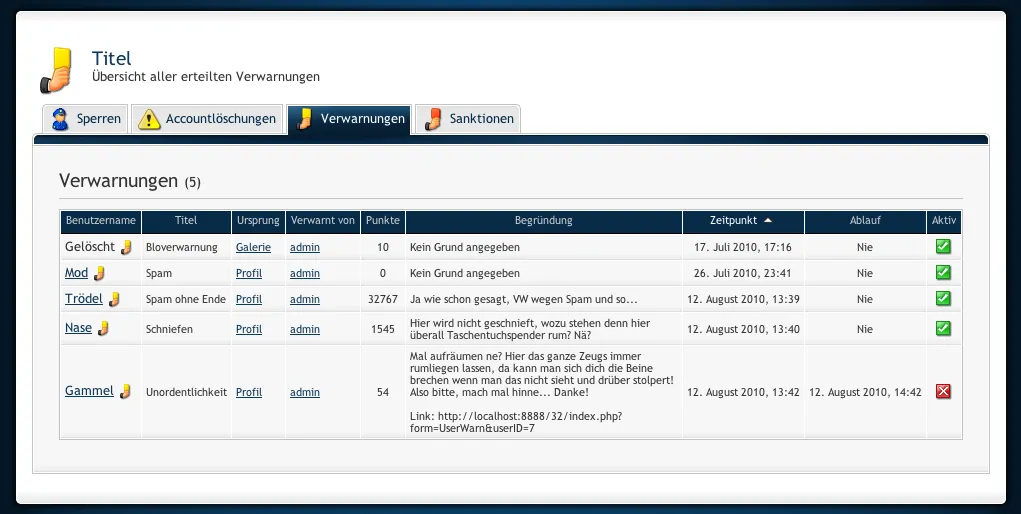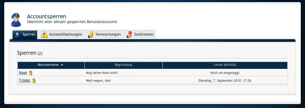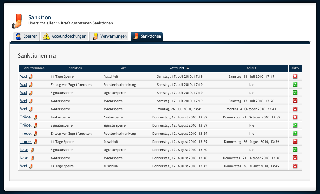 MIt diesem [lexicon]Plugin[/lexicon] könnt ihr Sperren, Löschungen, Verwarnungen und Sanktionen auf eigenen Seiten im Forum darstellen: