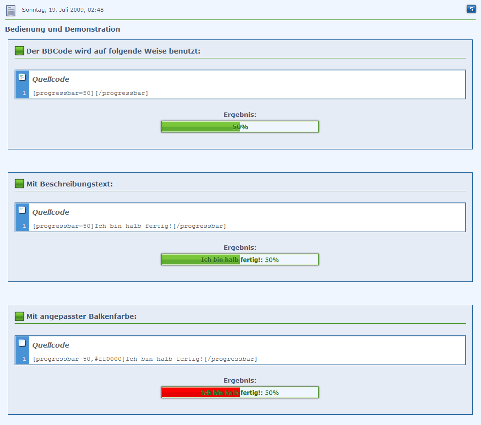 Dieses PlugIn erweitert den WYSIWYG-Editor des WCFs um den BBCode "progressbar", welcher das Einbinden eines Fortschrittbalkens ermöglicht.