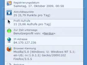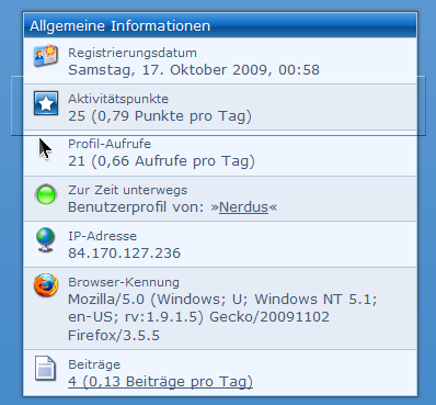 Dieses Plugin fügt die Spalte »Aktivitätspunkte« in die Liste der »Allgemeinen Informationen« im Benutzerprofil ein.