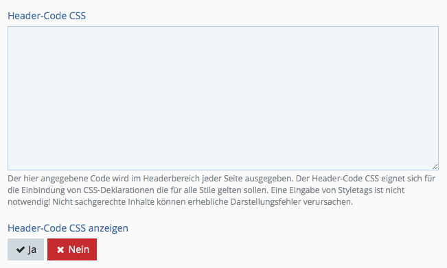 Diese Erweiterung ermöglicht das Einfügen von zusätzlichem Code im Seitenheader innerhalb der <head>-Tags. Es lassen sich folgende Inhalte einfügen: