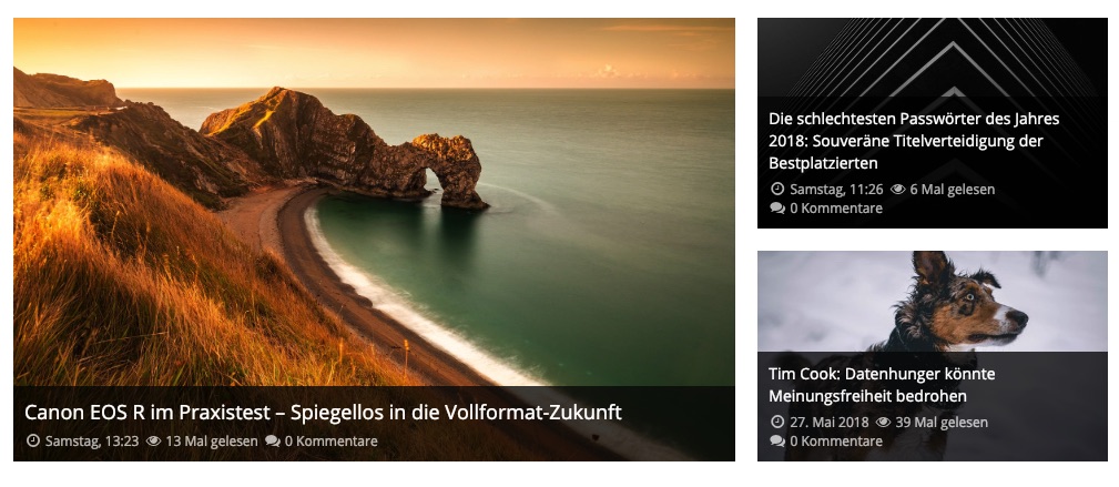 3. Ein großes Artikelbild links, zwei kleine Bilder rechts daneben: