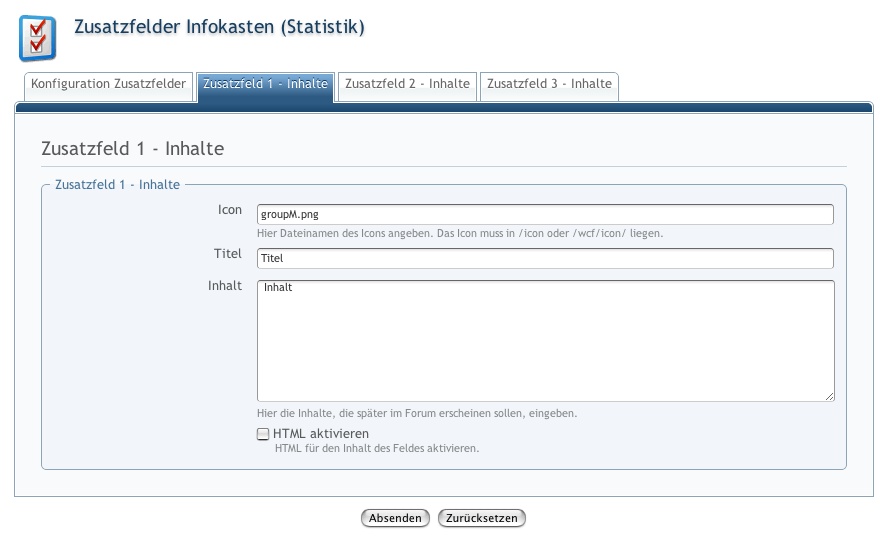 Mit diesem [lexicon]Plugin[/lexicon] können ganz bequem und ohne Templatepatch bis zu drei zusätzliche Felder im Infokasten (Statistikkasten) angelegt werden. Inhalte können entweder als Text oder im HTML-Format eingefügt werden.