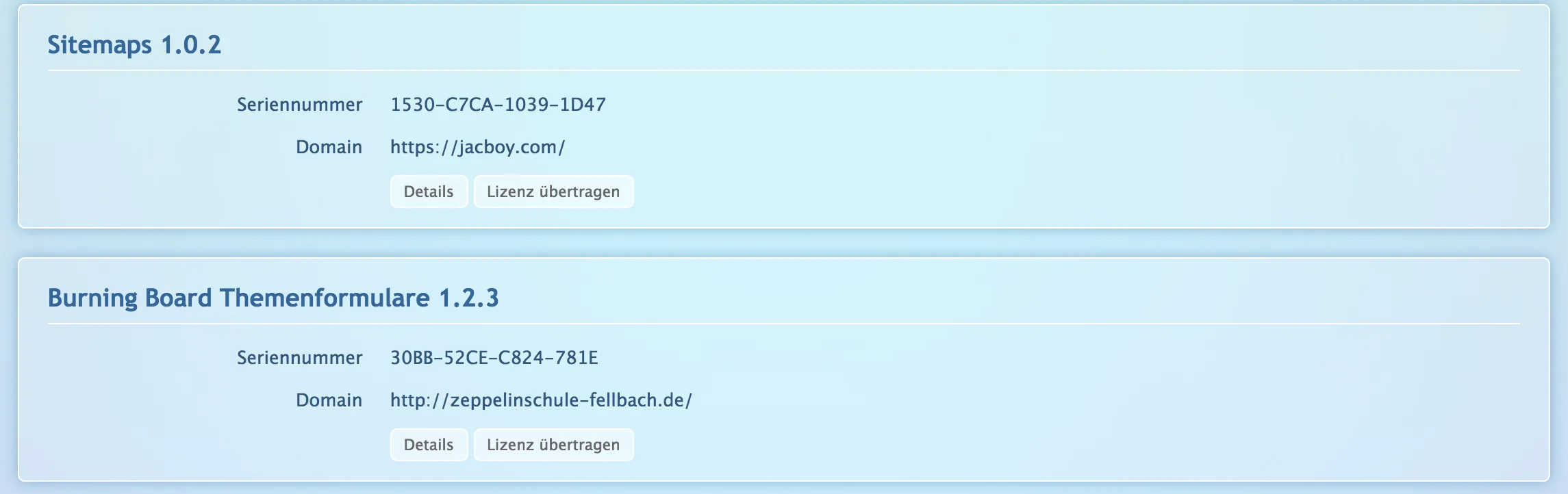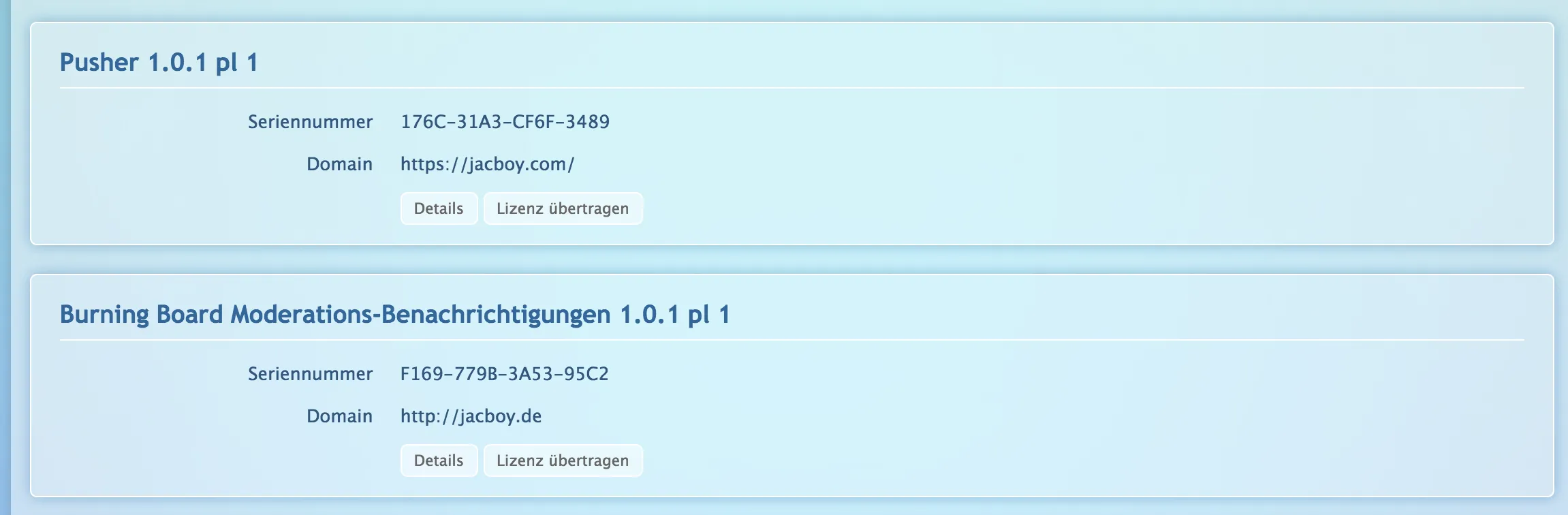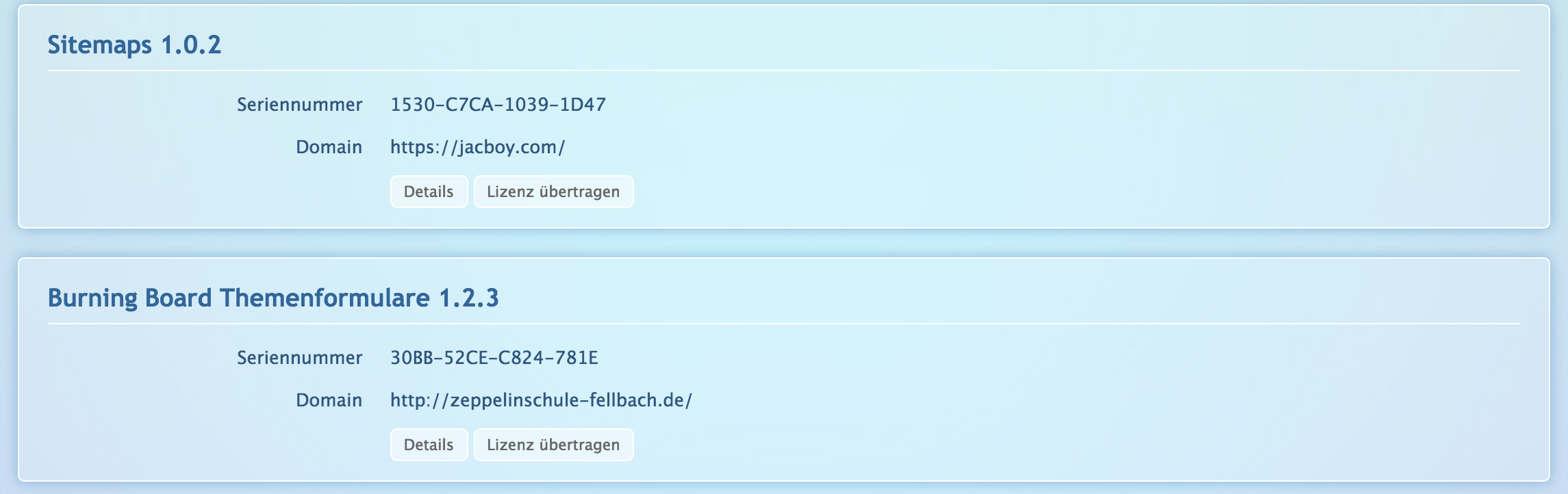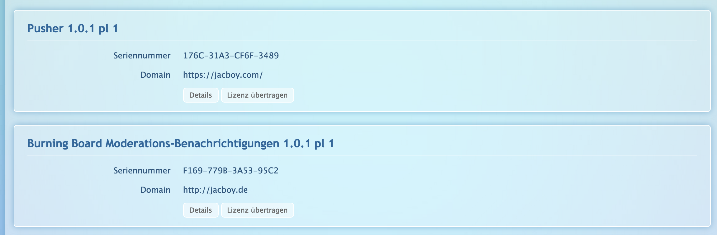 Nach dem Kauf werden die Produkte auf das eigene Konto übertragen. Legt dafür bitte bei WCFLabs ein Benutzerkonto an und teilt mir eure Adressdaten sowie den vollständigen Namen sowie die E-Mail Adresse mit. Habt ihr schon ein Konto und sogar schon etwas gekauft, benötige ich für den Transfer nur die Kundenkontonummer (einsehbar auf Mein Konto). Für den Transfer fallen keine Gebühren an. Alle genannten Erweiterungen sind unter WCF 2.1 / Burning Board 4.1 lauffähig.