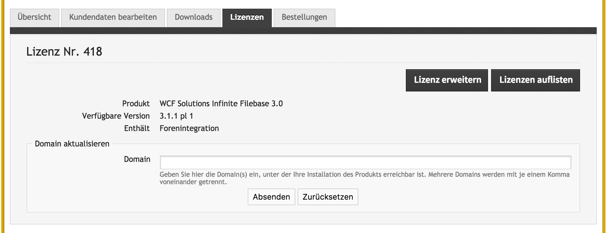 Da ich mein Projekt aufgebe, möchte ich meine Lizenz der Infinite Filebase 3.1 von WCFSolutions veräußern. Sie enthält neben dem Hauptprodukt auch die Integration für das Burning Board 4.0 / 4.1.
