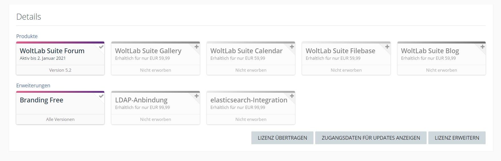 ich biete hier eine WoltLab Suite 5.2 Foren Lizenz inklusive der Branding Free an. Die Lizenz wird auf dein Account übertragen, für die Übertragungsgebühr (14,99€) von WoltLab komme ich auf bzw. diese sind im Preis schon inklusive.