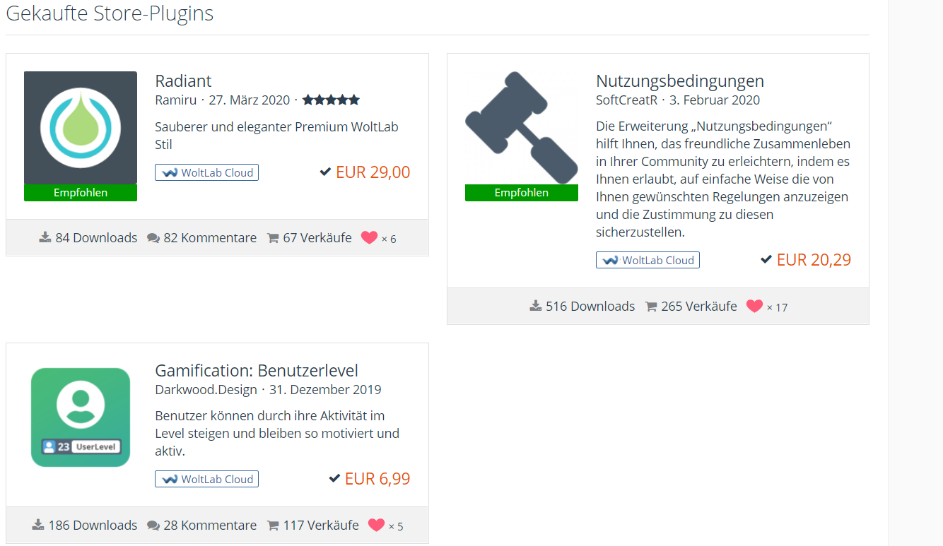 Moin, ich biete meinen Account mit folgenden Sachen an: Woltlab WoltLab Suite Forum 5.2.7 und folgende Plugins: Radiant (Style) Nutzungsbedingungen Gamification: Benutzerlevel Bevorzugt PP oder alternativ auch per Bunq 100€