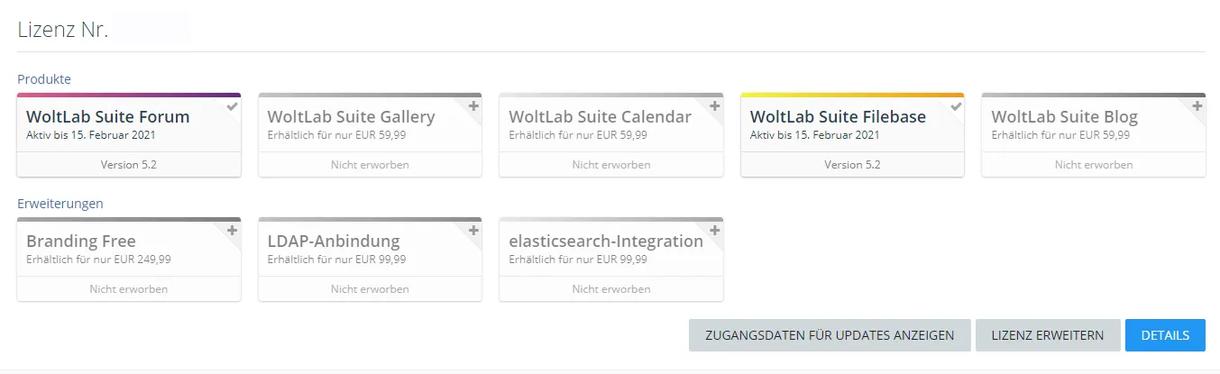 Ich biete hier meine Woltlab 5.2 Lizenzen mit Updatezugang bis 15.02.2021 an. Enthalten ist: Woltlab Suite Forum 5.2 (99,99€) Woltlab Suite Filebase 5.2 (59,99€) Gesamtpreis Neu: 159,98€ Mein Preis exclusive Übertragunsgebühr von Woltlab (14,99€) wären 65€. Zahlung ausschließlich per PayPal. 65€