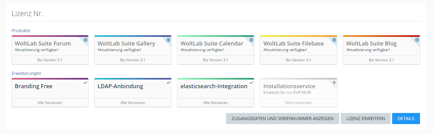 | 1 | WoltLab Suite Forum 5.1, Gallery, Kalender, Blog, Filbase, Branding Free, LDAP-Anbindung, Elasticsearch-Integration (Siehe Screenshot 1) | 1 | 789,92 € |