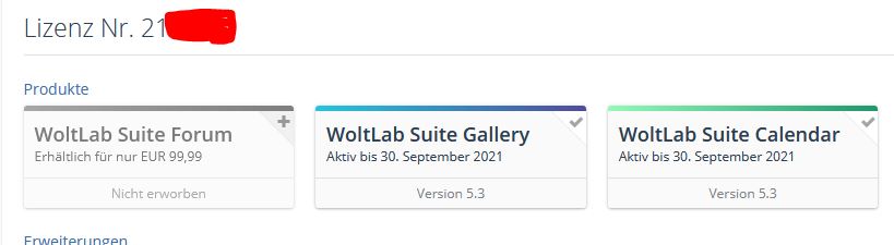 Guten Tag,ich biete hier meine Woltlab Suite 5.3 Lizenz an. Die gesamte Lizenz wird auf dein Konto übertragen, die Transfergebühr (14,99€) übernehme Sie.Zahlungsmethoden:- PayPal- ÜberweisungBei Interesse kann man mich gerne hier per Konversation kontaktieren. Für Angebote bin ich Offen. 70 €