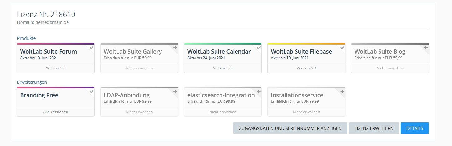 Guten Tag ich verkaufe meine Woltlab Lizenzen.Es handelt sich um eine Lizenzübertragung. Die 15€ gebühren übernehme ich.Bezahlung über PayPal oder Überweisung.MfG Jan B. 200€ (VHB)