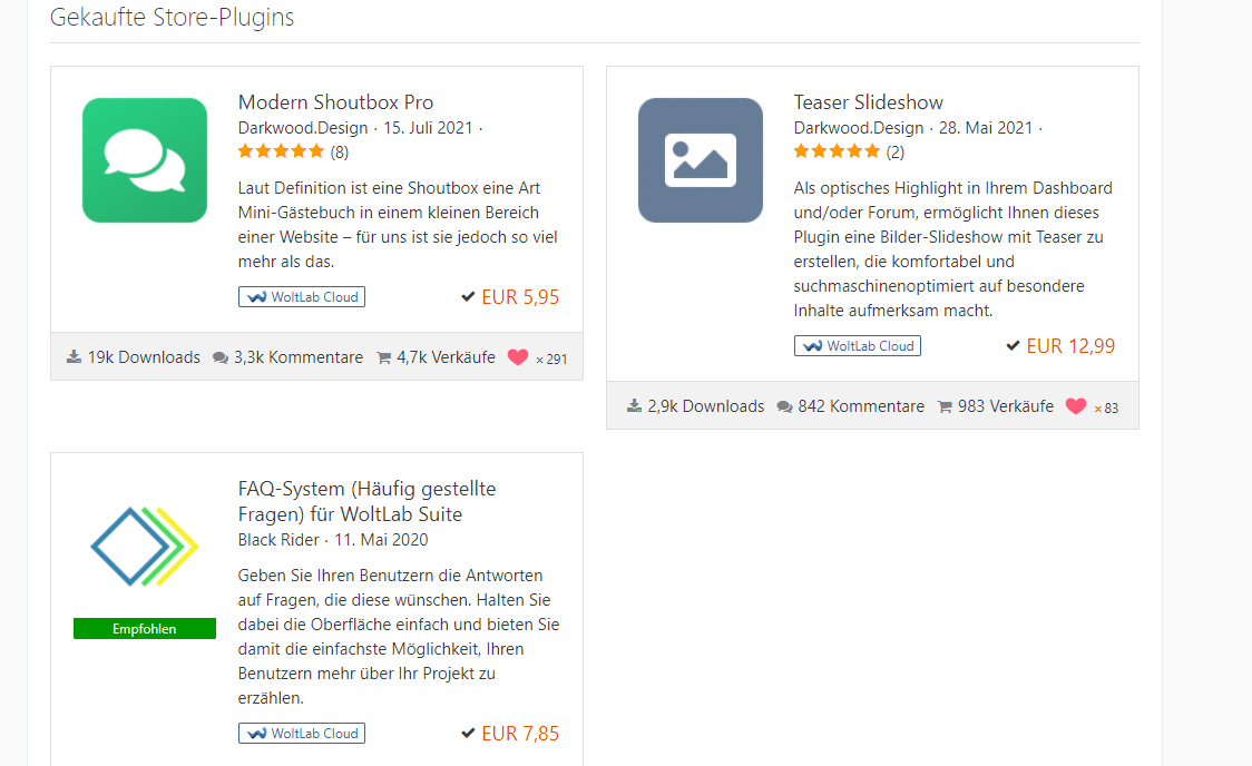 Biete hier einen kompletten Account mit:WoltLab Suite Forum (Burning Board) Vers. 5.1.18WoltLab Suite Blog Vers. 3.1.17zusätzlich 3 Plugins:Modern Shoutbox ProTeaser SlideshowFAQ-System (Häufig gestellte Fragen)Bezahlung per PayPal 80 EUR VB