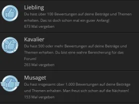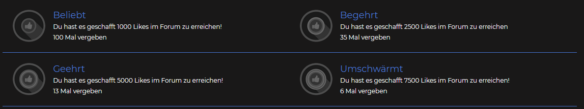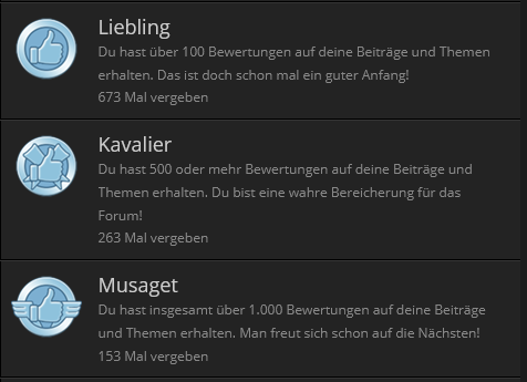 Hier gut zu erkennen ist, dass die Trophäen aufeinander aufbauen. Sie unterscheiden sich lediglich in einem winzigen Detail, behalten jedoch Farbe, Größe und z.B. das Erkennungsmerkmal (Daumen hoch).
