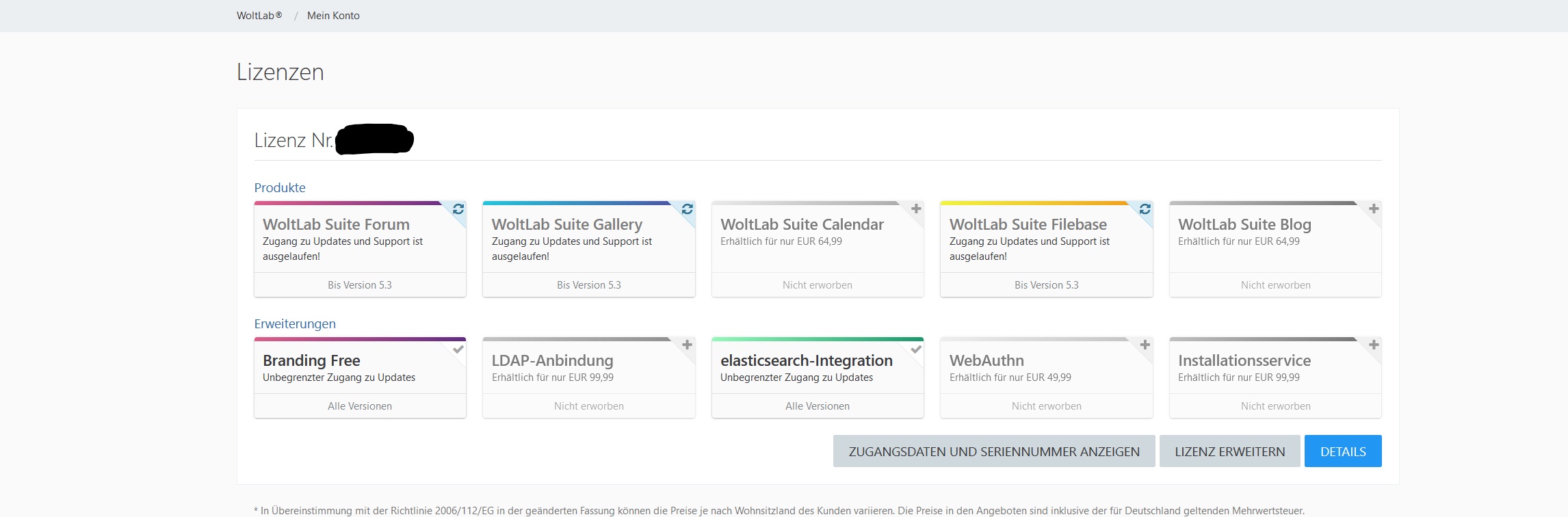 Bei Neukauf der Lizenzen zahlt man fast 600€ und man müsste jährlich für die Branding Free 124,99€ bezahlen und für Eleasticsearch auch nochmal 49,99€.