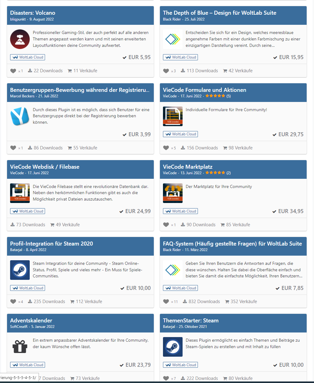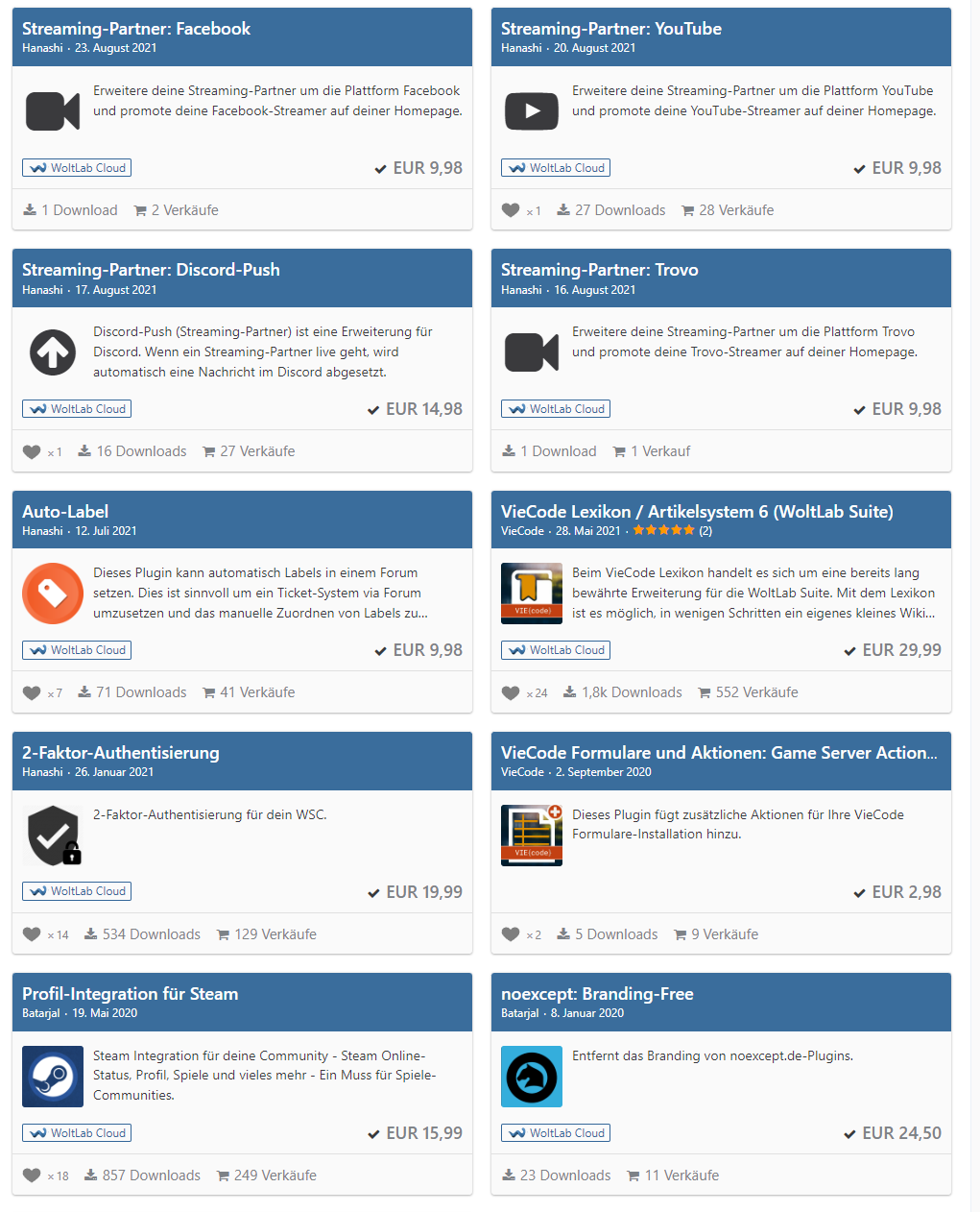Bitte Woltlab Lizenz an mit diversen Plugins auch außerhalb von Woltlab direkt selber.und einige mehrEasyMedia - Bilder, Video, AD usw...Community Bot -> fast alle 500 VHB