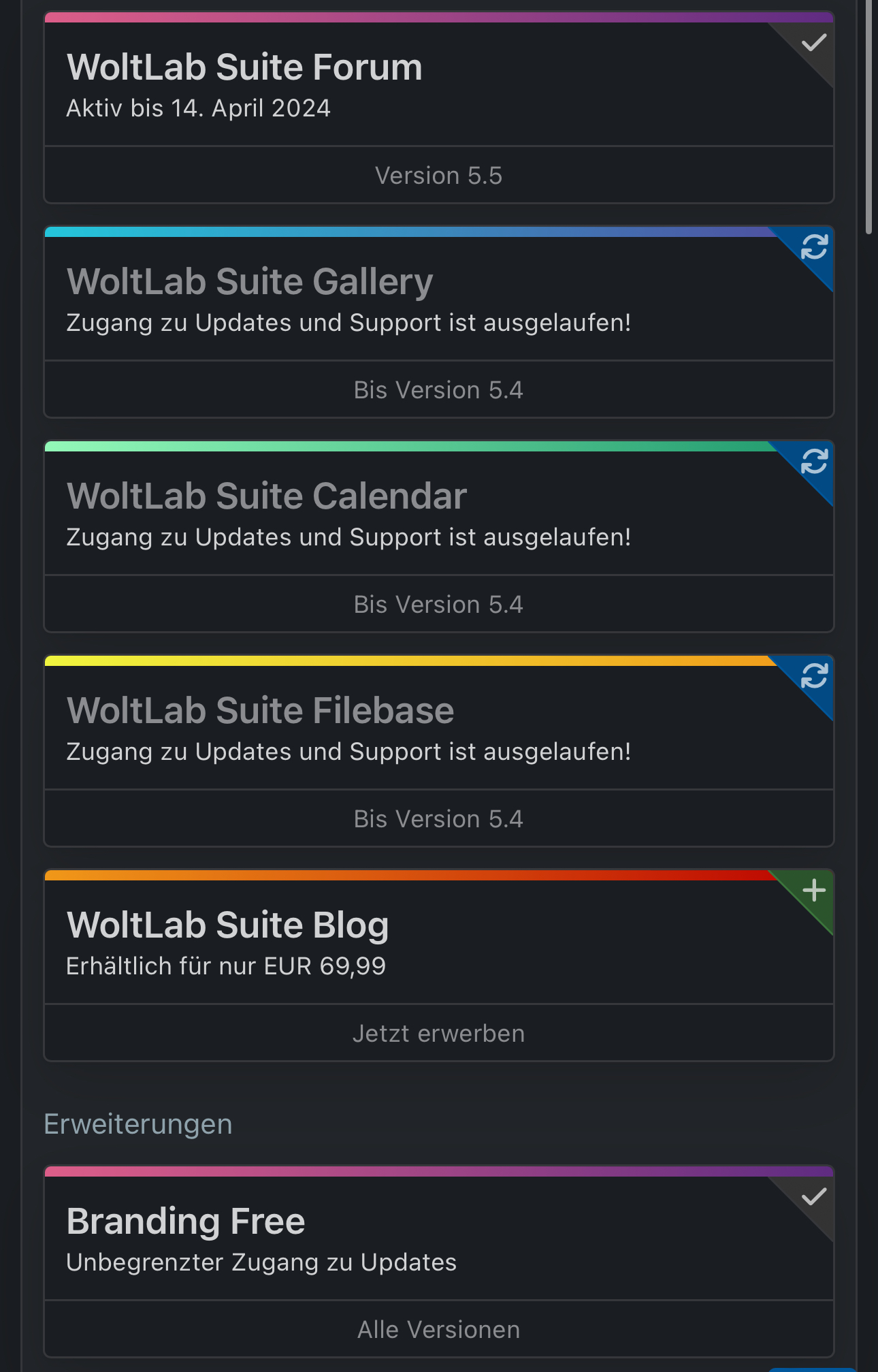 • Guten tag, ich verkaufe meine Lizenz mit der Forum Version 5.5 (Support bis 14.4.24). Zudem gibt es die Galerie, filebase und den Kalender bis zur Version 5.4 dazu. Höhe Punkt des Angebots ist die lebenslange Branding Free Lizenz die dabei ist, daher auch der Preis.