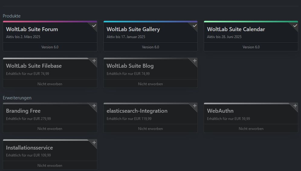 Die Lizenz ist bis Januar 2025 (Galerie) bzw. März 2025 (Forum) und Juni 2025 (Kalender) aktiv und erhält bis dahin auch alle neuen Versionen die bis zu diesem Datum erscheinen.