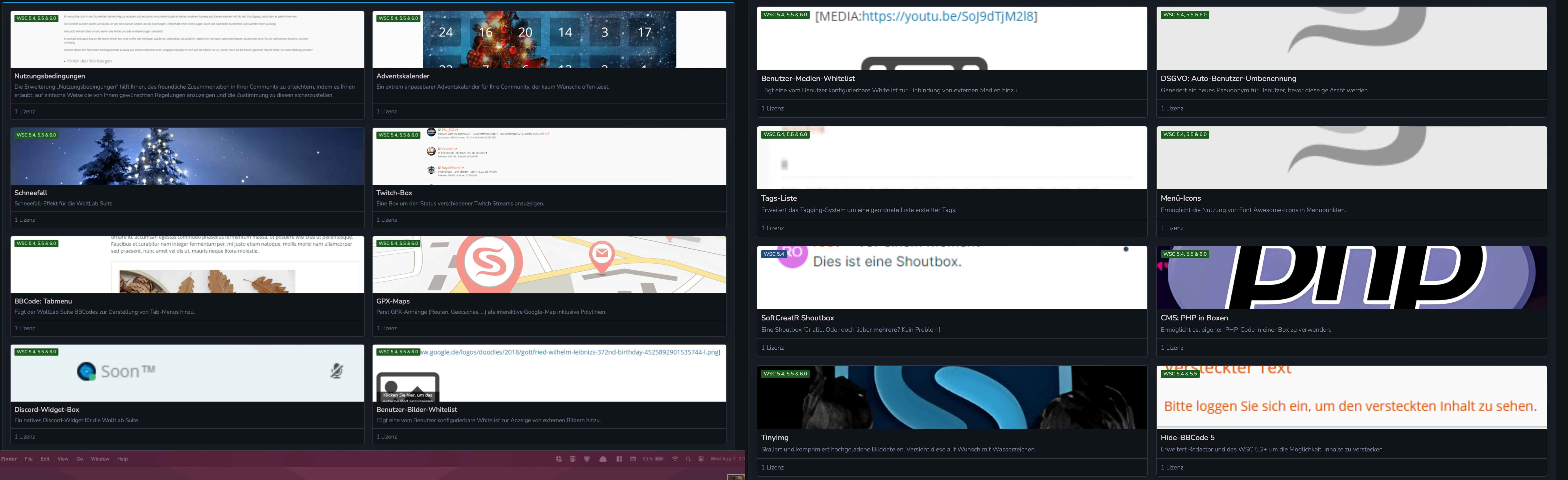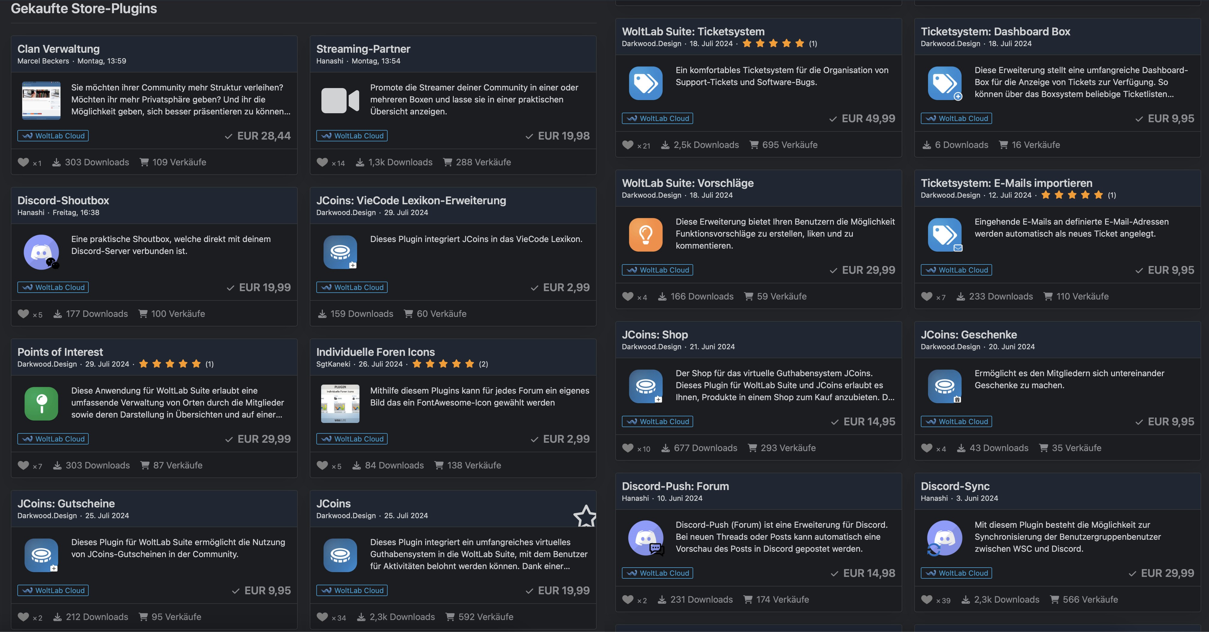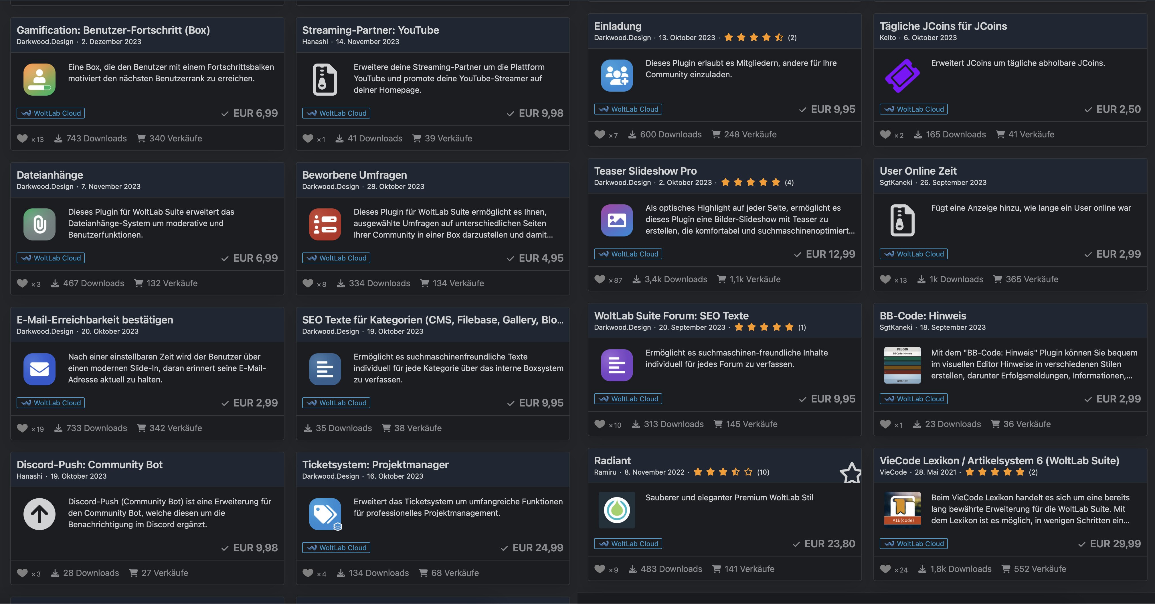 Hi zusammen, aufgrund persönlicher und zeitlichen Gründen muss ich mein Projekt aufgeben. Daher biete ich meine WoltLab Suite 6.0 Lizenz für das Forum zusammen mit allen Plugins, die ich vom WoltLab Store und externen Stores erworben habe, zum Verkauf an. Die Übersicht aller Plugins können im Anhang entnommen werden.