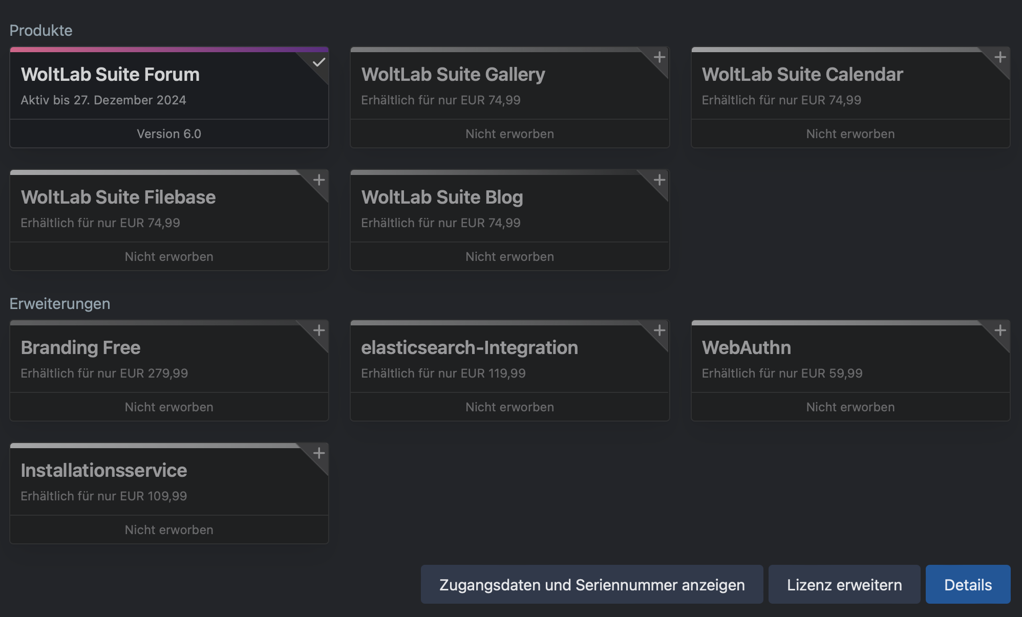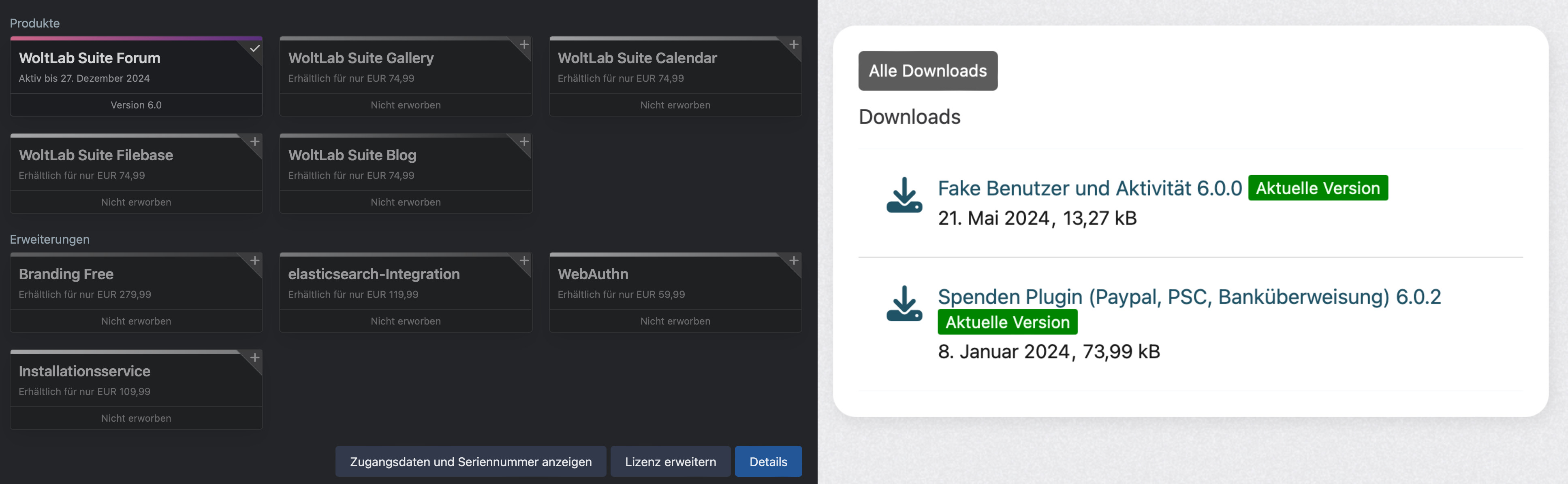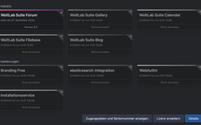 Die WoltLab Suite 6.0 Forum Lizenz ist noch bis zum 27. Dezember 2024 gültig. Die Lizenz wird an ein gewünschtes Konto übertragen. Die Kosten hierfür sind im Preis inklusive. Für die zwei direkt erworbenen Plugins von der Seite Darkwood.Design wird der Account übergeben, da es hierfür keine Möglichkeit gibt, die Lizenz an ein anders Konto zu übertragen. Plugins von der Seite SoftCreatR.dev wurden als Season Pass 6.0 erworben und können übertragen werden.