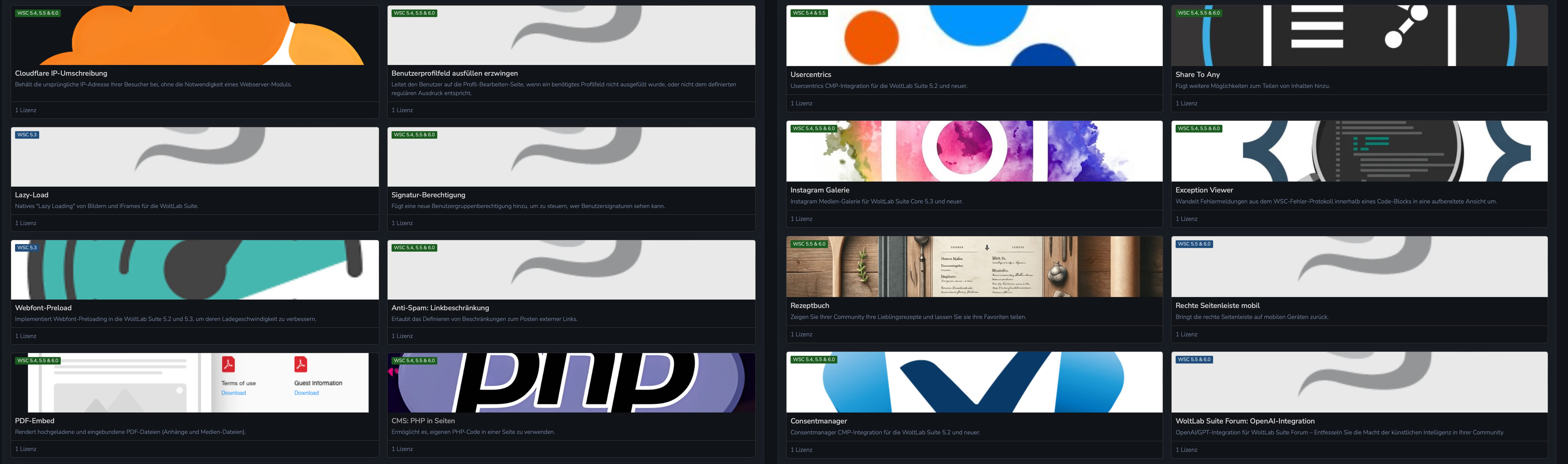 Außer den Plugins/Stile “Clan Verwaltung”, “Account-Switcher/Benutzer verlinken”, “Gamification: Benutzerlevel”, “Gamification: Benutzer-Fortschritt (Box)” und “Radiant” sind alle Plugins kompatibel mit der WoltLab Suite 6.0.