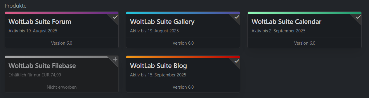 Hallo zusammen, ich biete hier eine Woltlab-Lizenz zum Verkauf an. Nur im Paket, nicht einzeln möglich. Der Update-Zugang ist noch bis August bzw. September 2025 gültig.