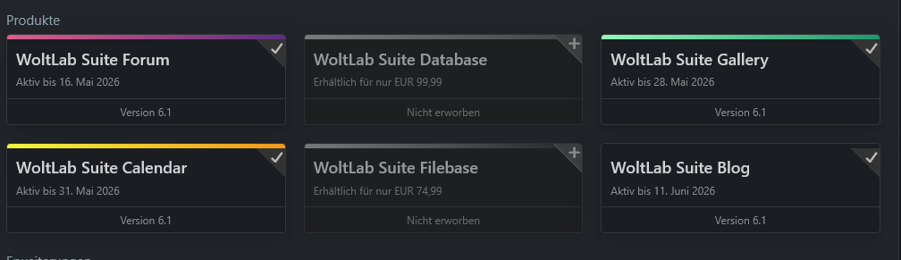Die Lizenz ist bis Mai 2026 (Forum, Galerie und Kalender) bzw. Juni 2026 (Blog) aktiv und erhält bis dahin auch alle neuen Versionen die bis zu diesem Datum erscheinen. Also auch die neue Version 6.2.