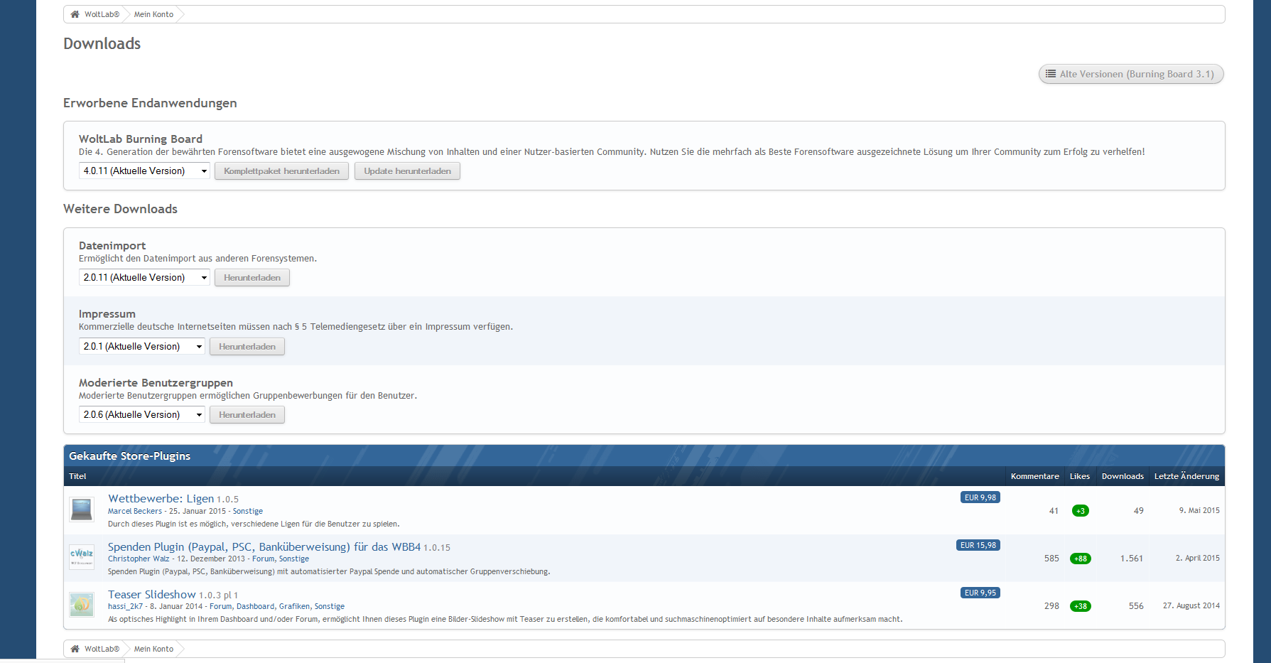 Ich biete meine WBB 4.0.11 Lizenz an mit folgenden Erweiterungen: Wettbewerbe: Ligen Spenden Plugin (Paypal, PSC, Banküberweisung) für das WBB4 Teaser Slideshow Übergeben wird der ganze Account!Bezahlung via Überweisung oder PayPal. 50€