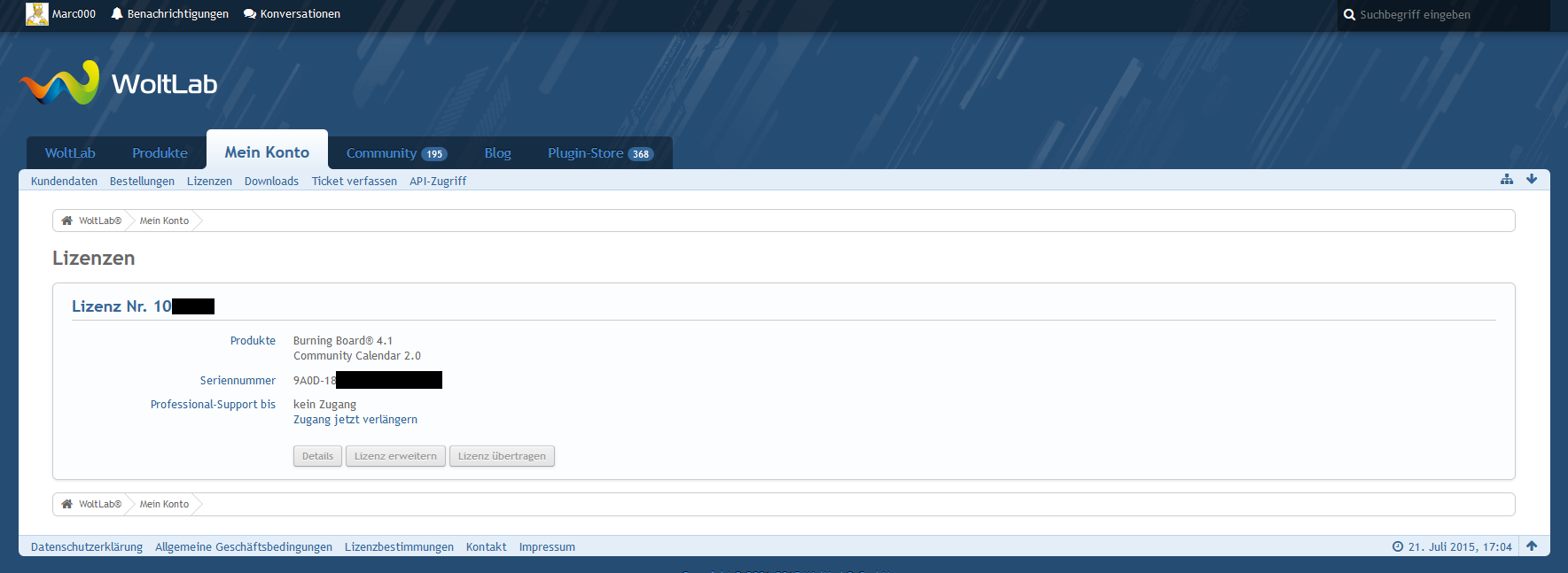 Ich habe gerade den Screen mit der Lizenz. Bitte immer Seriennummer und Lizenznummer Unkenntlich machen.