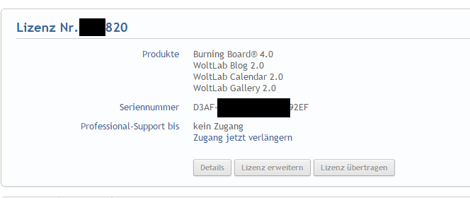 Ihr könnt entweder den kompletten Account übernehmen bei Woltlab oder ich übertrage euch Die Lizenz ( +Übertragungsgebühr)