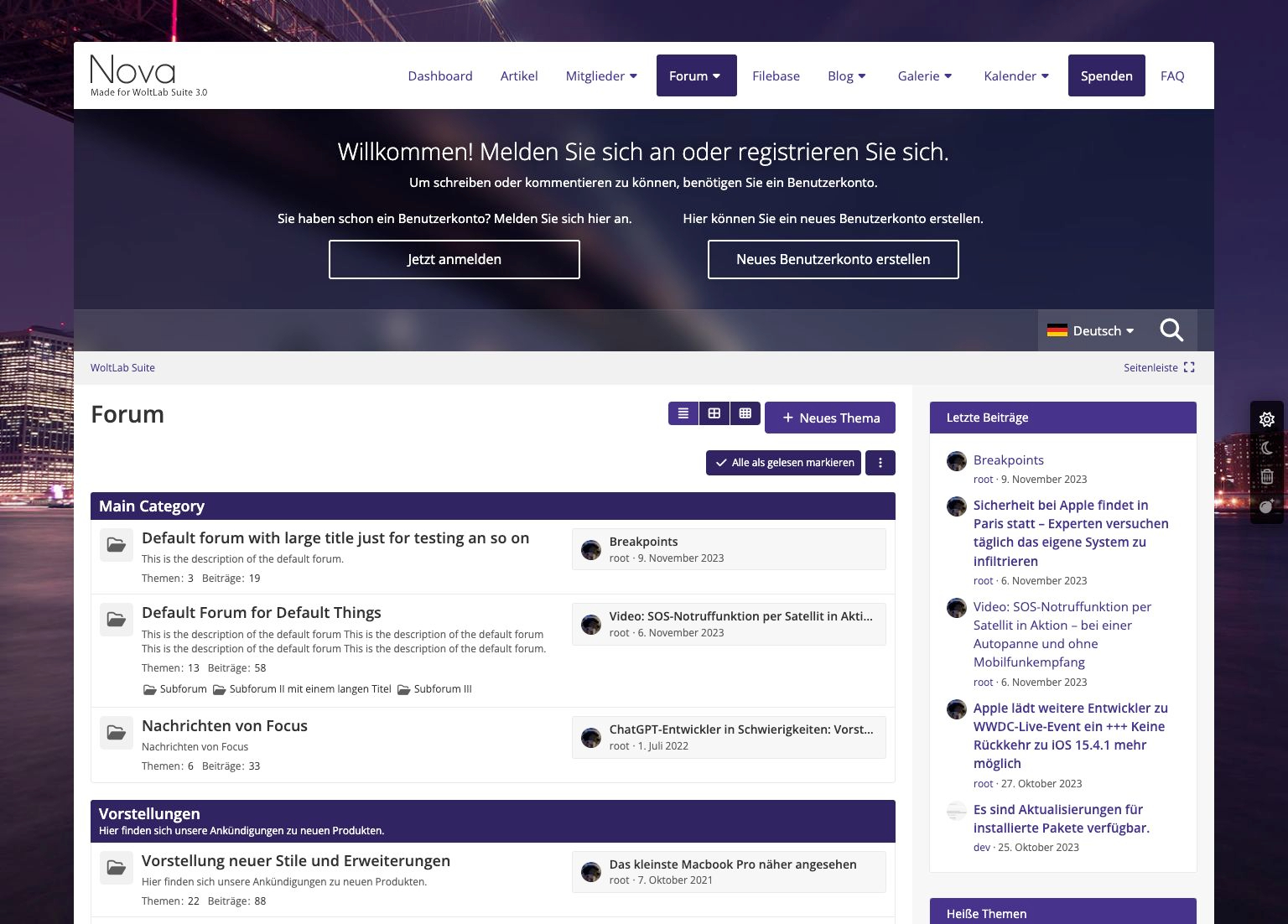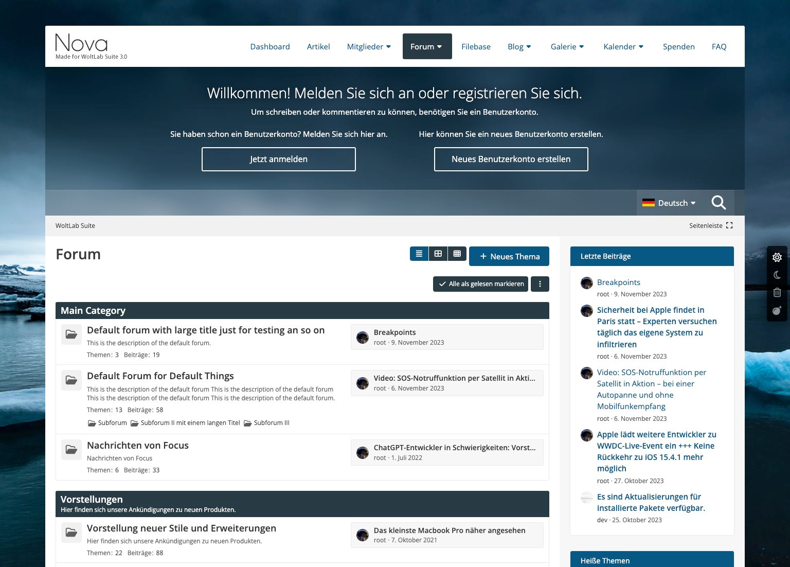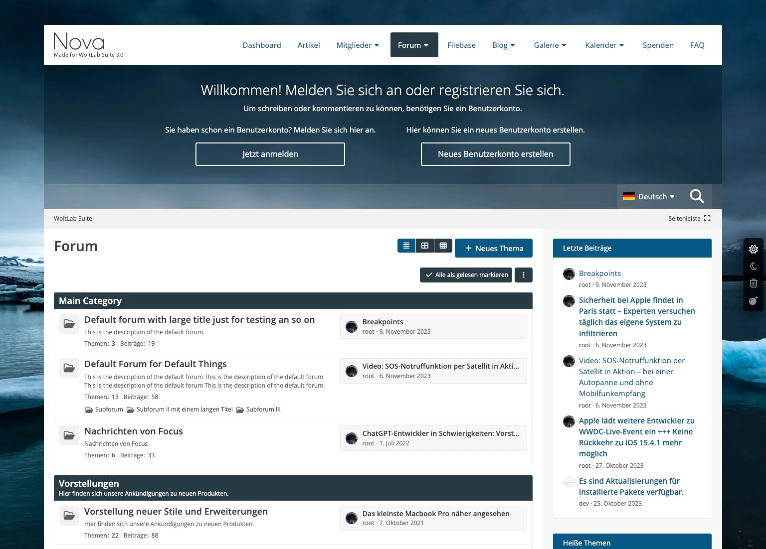 Nova - der neue Stern am Designhimmel, der jedes Forum zum Zentralgestirn macht. Hier treffen stilvolle Eleganz auf fortschrittliche und vielseitige Elemente, wie bereits der breite Header offenbart. In Anlehnung an Websites steht die Leseranrede zentriert, das spätere Userpanel bekommt so seine exponierte und feste Stellung.