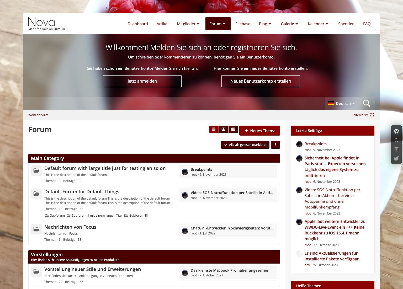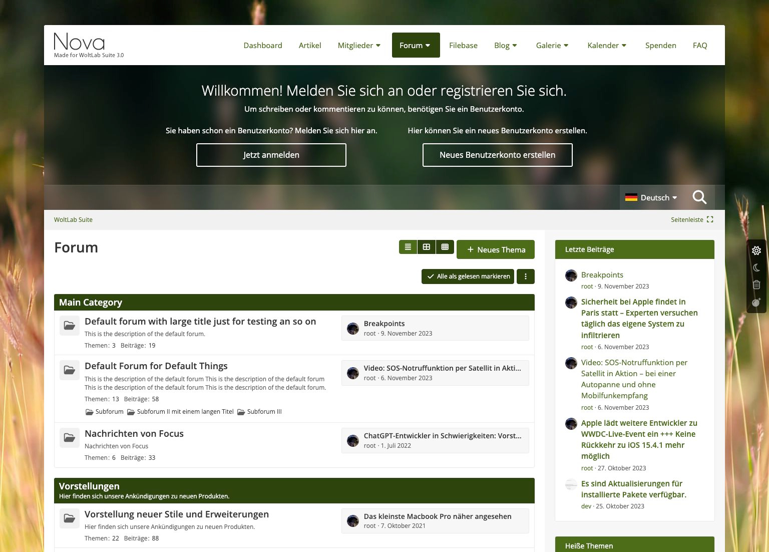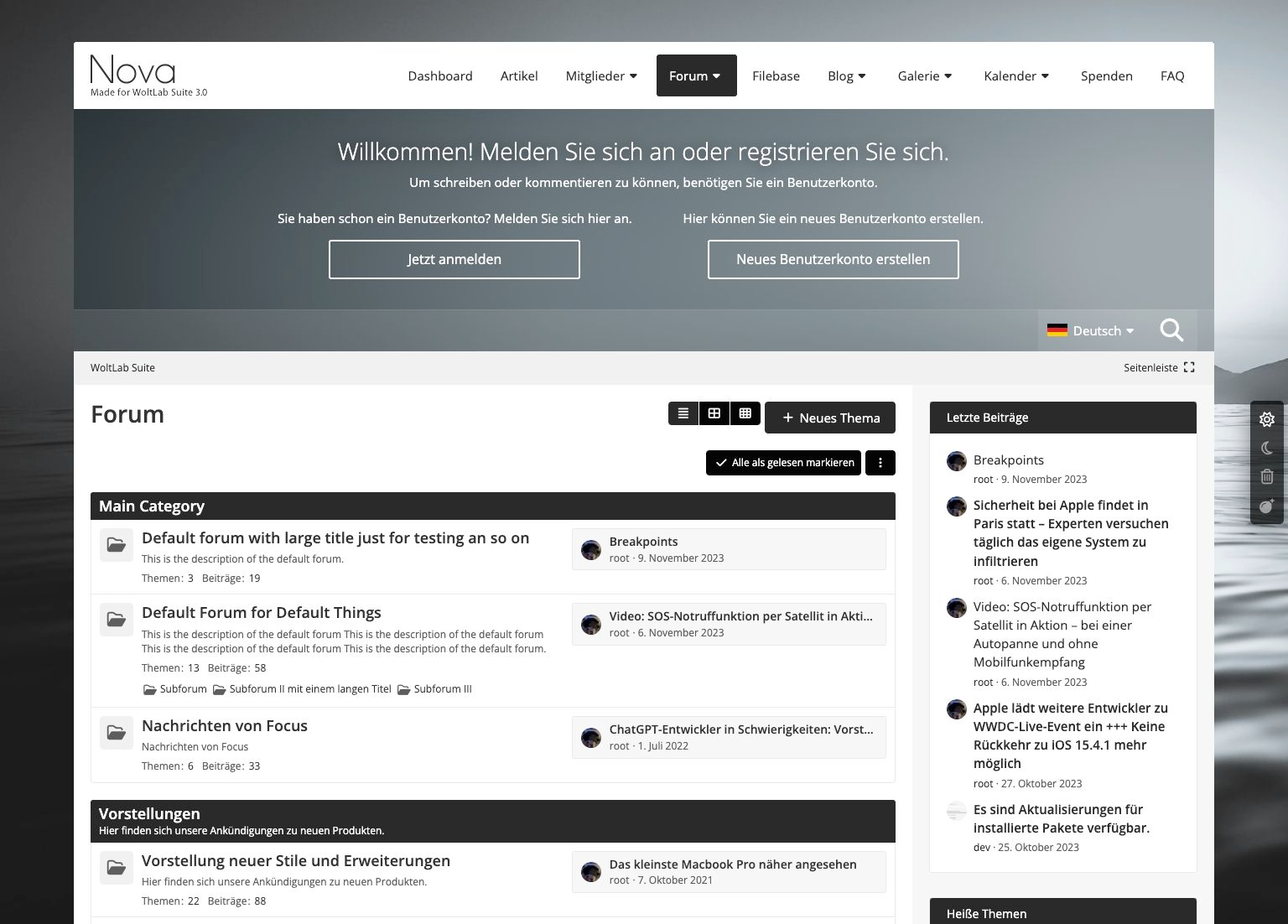 Nova - der neue Stern am Designhimmel, der jedes Forum zum Zentralgestirn macht. Hier treffen stilvolle Eleganz auf fortschrittliche und vielseitige Elemente, wie bereits der breite Header offenbart. In Anlehnung an Websites steht die Leseranrede zentriert, das spätere Userpanel bekommt so seine exponierte und feste Stellung.