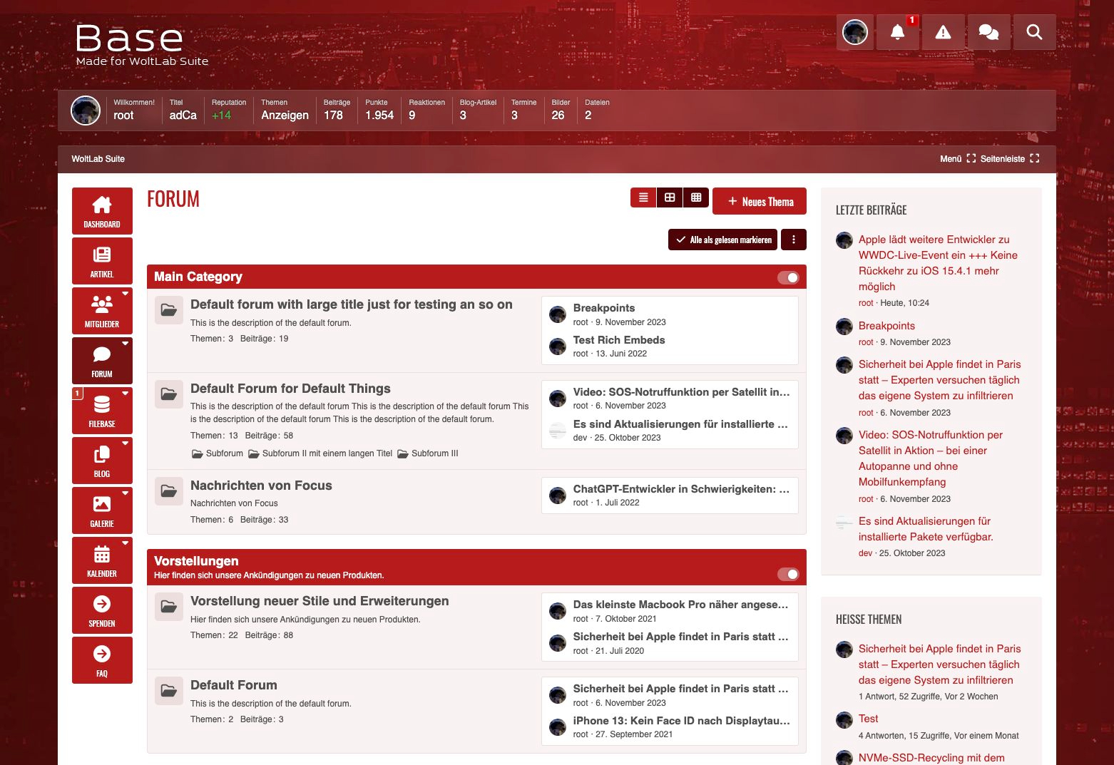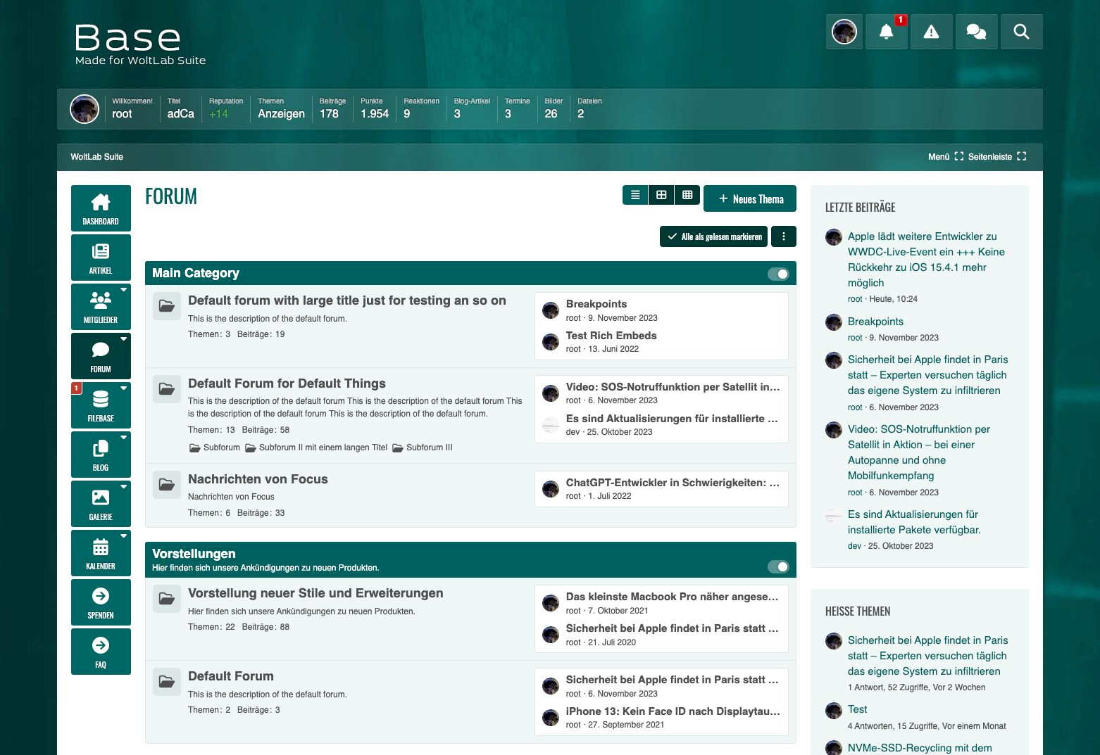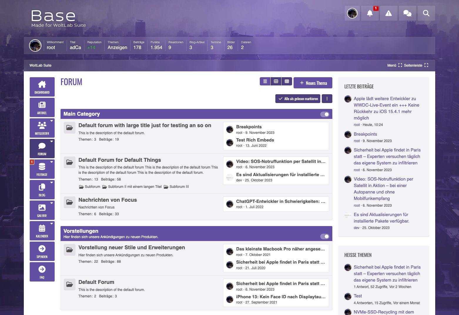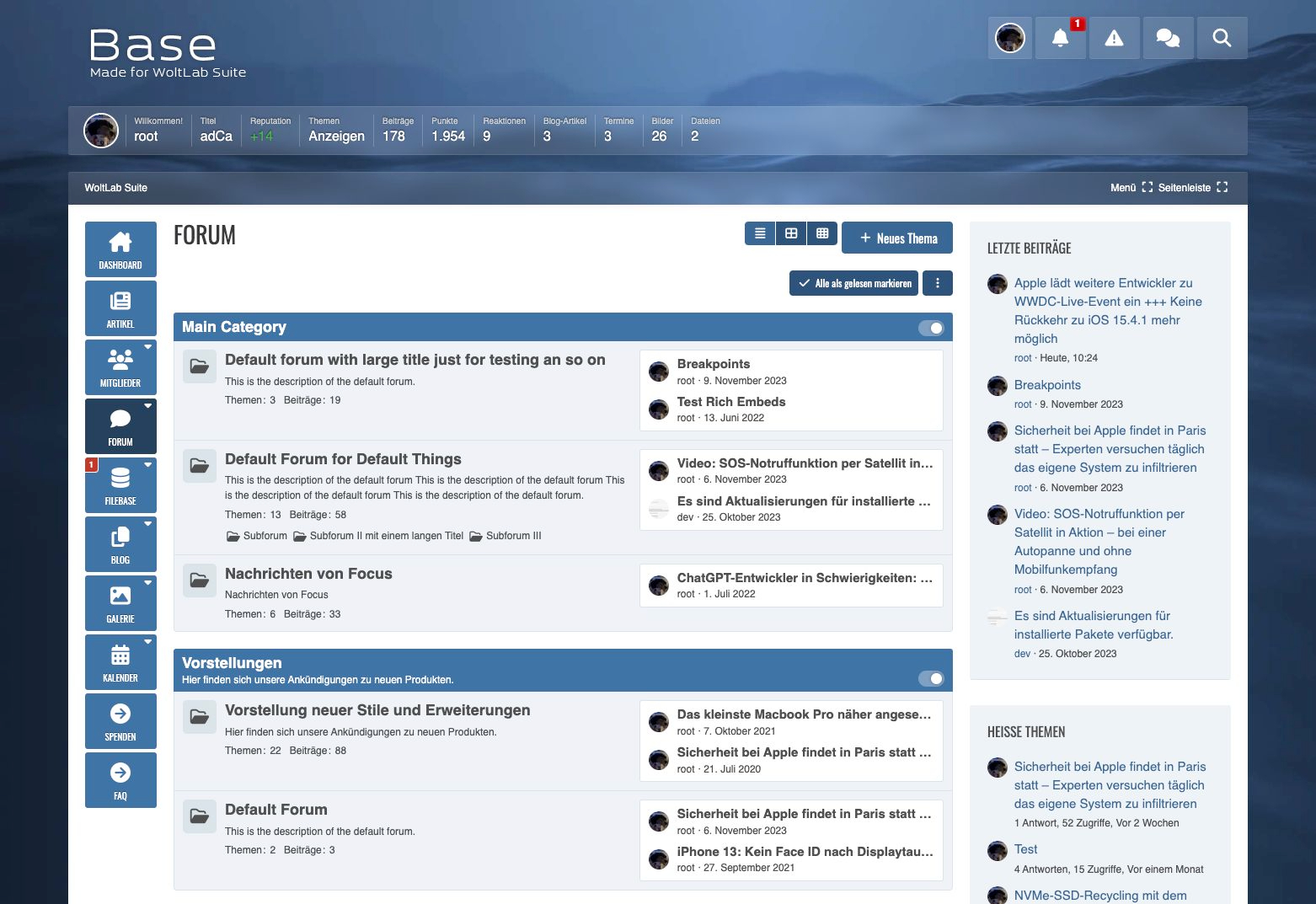 A style series is available with "Base", exuding elegance and generating attention by means of subtle effects. All menu items are equipped with large and unique icons. A registration request in the header section can be displayed or hidden for guests. For members, the displaying of statistics in the header area can be also globally displayed or hidden. Moreover, menu and userpanel can be toggled in "Base" into a compact representation.