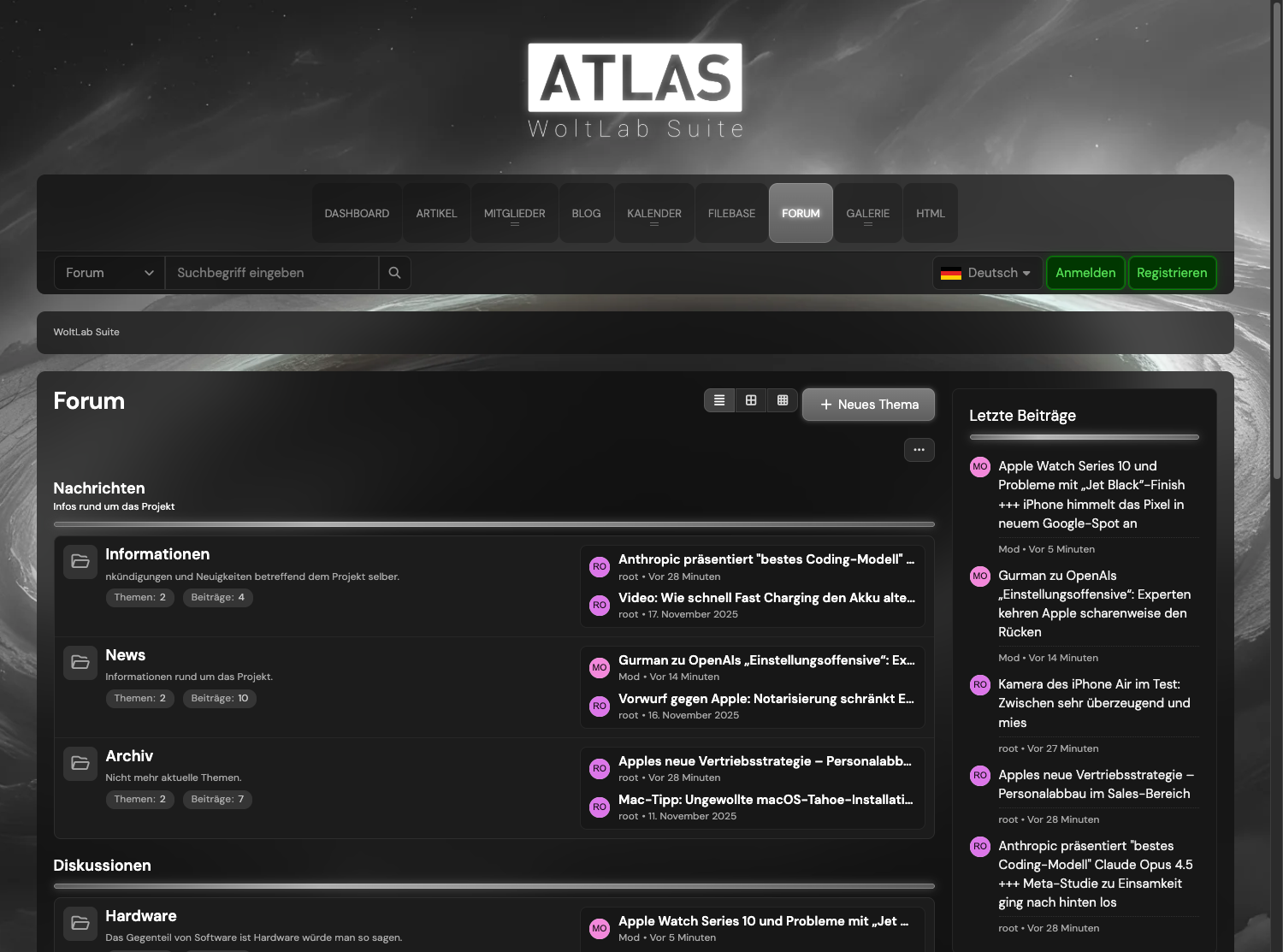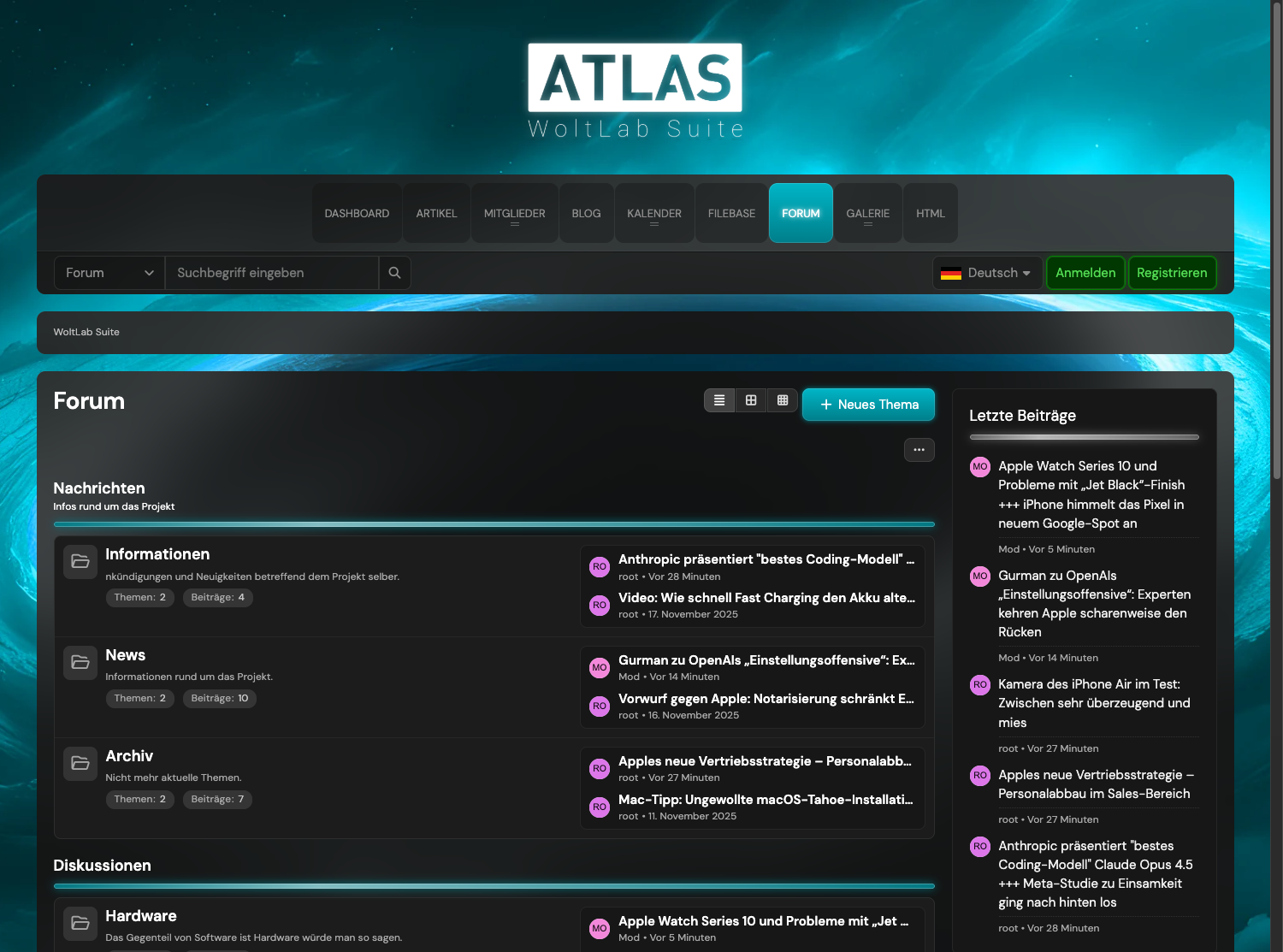 Atlas ist ein Stil auschließlich für WoltLab Suite erstellt. Gegenüber anderen Stilen besitzt Atlas einige Besonderheiten. So wird der Header beim Scrollen in einer verkleinerten Darstellung am Bildschirmrand fixiert.
